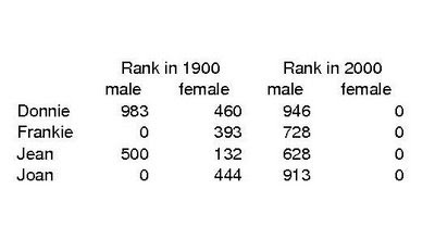 In other words, Loren/Lauren and Sidney/Sydney went from being modestly popular boys' names to being leading girls' names. But does it ever go the other way around? Do girls' names ever become boys' names? I wouldn't think so: Calling a girl "Joe" (or "Jo") or "Jack" ("Jaq") is cute; calling a boy "Anna" or "Mary" doesn't have quite the same effect. In fact, it might be perceived as something like a lifetime curse.